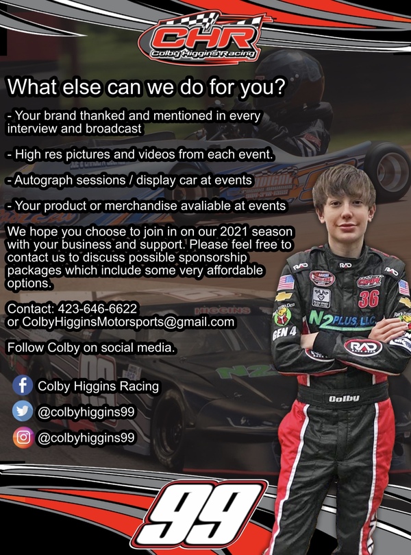 We are very blessed that the Majority of sponsors elected to stay on for 2022. But Colby will be racing a touring schedule and this will require additional funding for travel, hotels, food and entry fees for he and his team. We have several options available and it is tax deductible if interested Please call Chuck Higgins 423-646-6622. #carstour2022
